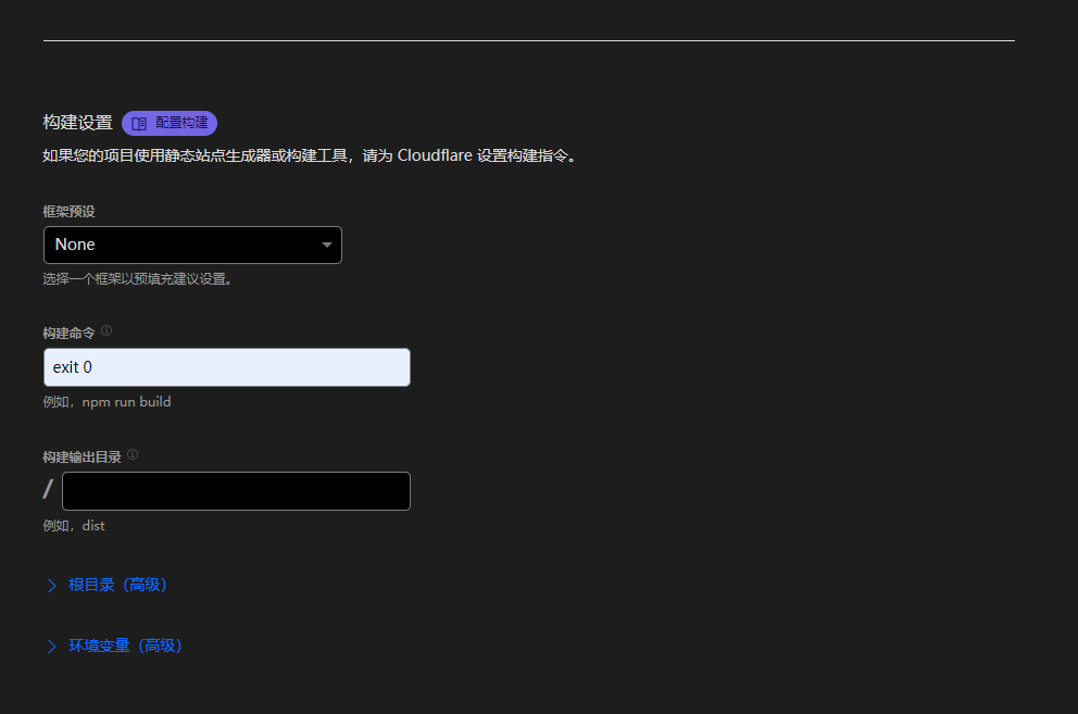 一般来说我们要在“框架预设”中,设定你所使用的框架,但是由于某些原因,Cloudflare Pages 移除了对 Hexo 的支持,导致你现在无法在这里选择到 Hexo,不过没关系,由于我们推送的是已经构建好的网页文件,因此移除与否均不会影响我们使用,在“构建命令”中填入