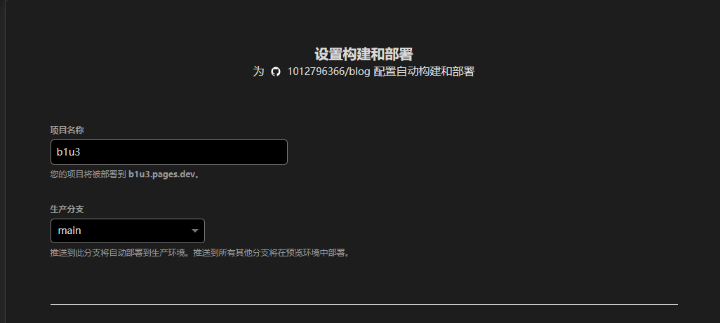 之后给你的项目进行设定,项目名称自拟,生产分支选择先前我们所推送到的分支,也就是我们先前在 _config.yml 中为 branch 设定的参数,如果不记得了就回头看一下吧。