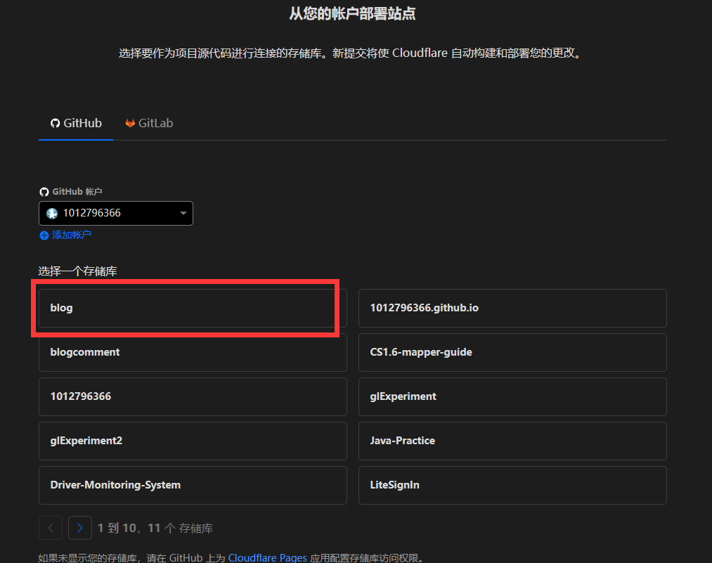 如果这是你第一次使用,Cloudflare 会要求获得你的 GitHub 账号授权,建议勾选上“All Repository”选项,确保将来构建的仓库也可以被 Cloudflare Pages 抓取。接着,找到你先前推送的仓库,选择它。此处,我先前推送的仓库是 blog,则此处选择 blog。
