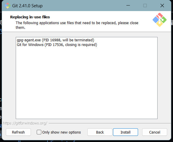 如果你没有立即进入安装界面,而是遇到这个,说明你可能已经安装了 Git for Windows,找到相应的程序并结束它,然后再执行安装。