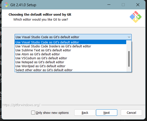 进入到下一步,选择默认的文本编辑器,根据你现在所使用的文本编辑器来决定。如果你有安装 Visual Studio Code,我推荐你使用它作为默认的文本编辑器,需要注意的是第二个带有 Insider 字样的 Visual Studio Code 为内测版 VSCode 之意。如果你什么都没听懂并且上面的软件一个都没装(又或者完全不会用),请选择 Notepad 选项,使用记事本作为默认的文本编辑器。