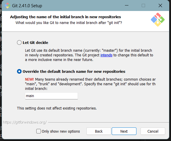 继续。请选择 Override the default branch name for new repositories 选项,并确保框中输入的是 main。这是因为 Git 目前还在使用 master 作为主分支,而常见的代码托管平台如 GitHub 认为 master 带有着浓厚的冒犯、奴隶色彩之意,故使用 main 来替代之。在推送时,你使用 master 作为主分支并不会使你遭遇什么严重问题,所以继续使用 master 分支也是没问题的。另请注意此处 Git for Windows 已经说明他们正计划在未来换用其他词汇来替代 master 分支,故建议此处直接更改为第二个选项,并选择 main 作为主分支,以避免未来版本可能导致的主分支问题。