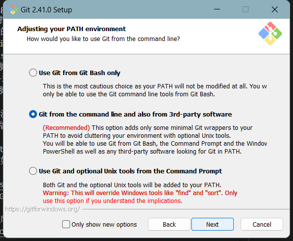 继续。选择第二个选项,这样你可以在普通的命令行终端如 PowerShell 和 CMD 使用 Git 而无需限制在 Git Bash 中(第一个选项)。