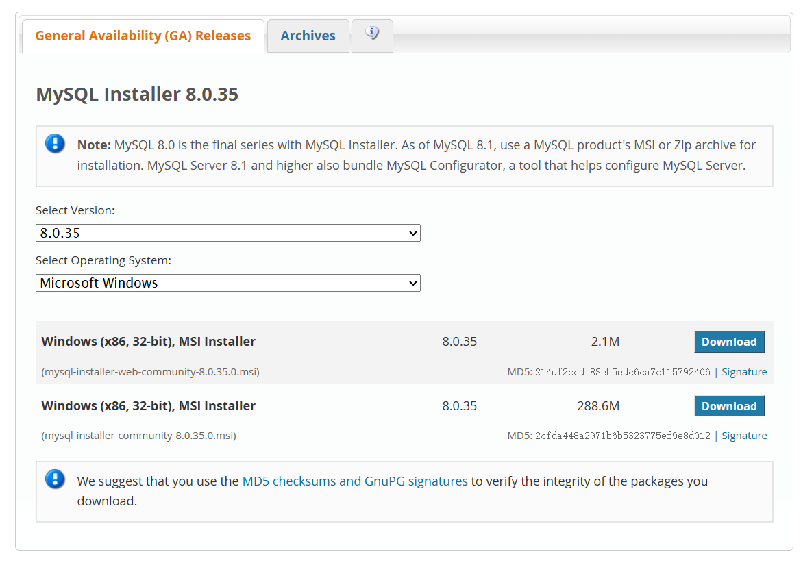 前往官网下载地址下载 Windows 版本的 MySQL 安装文件。