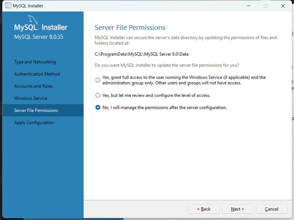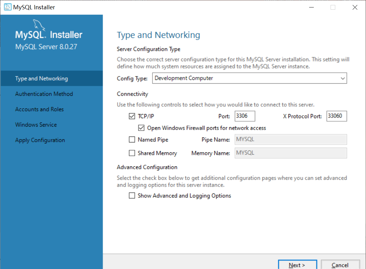 这将安装 MySQL 文件到 C 盘,如果你在意 C 盘的空间,请在第一个安装步骤中选择 Custom 安装,并在 Advanced Options 中自行更改安装路径。