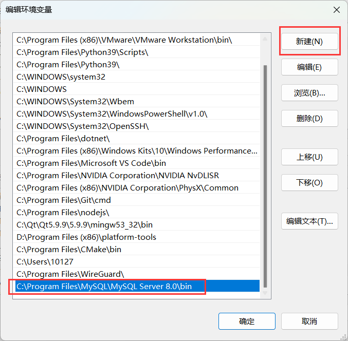 在接下来的窗口中,选择新建按钮,然后找到你的 MySQL 安装路径,复制并粘贴上去,最后点击确定即可。