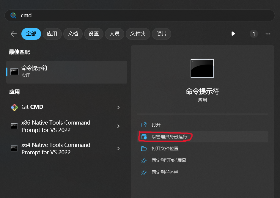 完成后,按 Win 键,调出开始菜单,输入 CMD 或者 PowerShell,并用管理员身份启动。