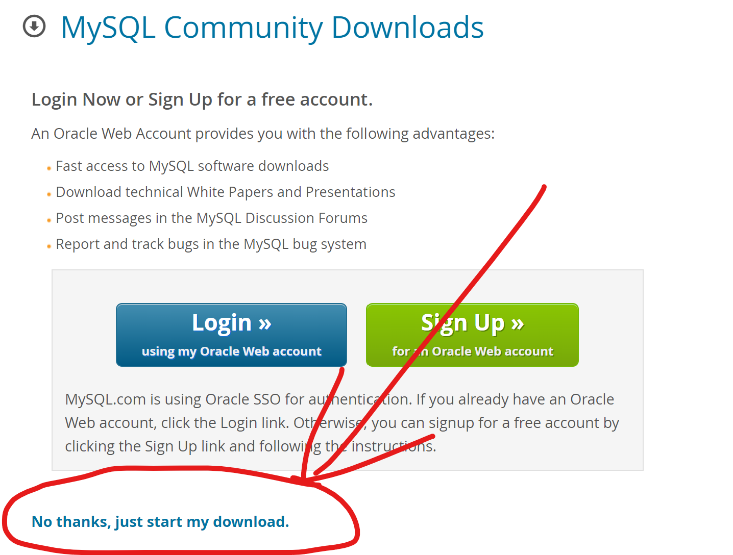 在下载页面,请直接选择 No thanks, just start my download. 按钮,你没有必要注册或者登录 Oracle Web 账户,如图所示。