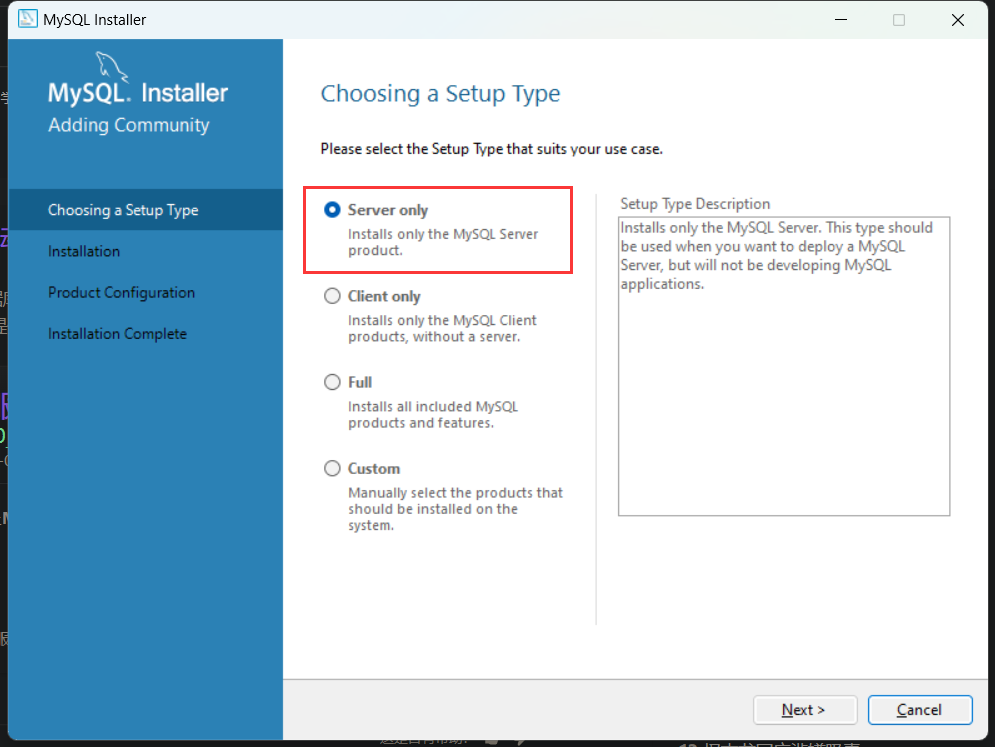 我们选择 Server only,我们只是需要在本地架设 MySQL 服务,不需要客户端加持。