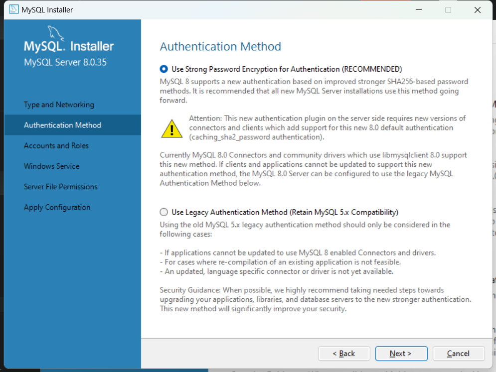 在认证方法中,选择第一项,我们不需要考虑兼容老版本的 MySQL 服务,所以直接选择第一项即可。
